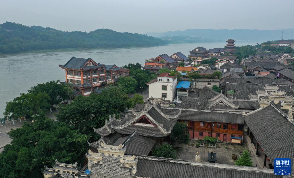这是2022年6月22日在四川省宜宾市长江边拍摄的李庄古镇(无人机照片)。新华社记者王曦 摄