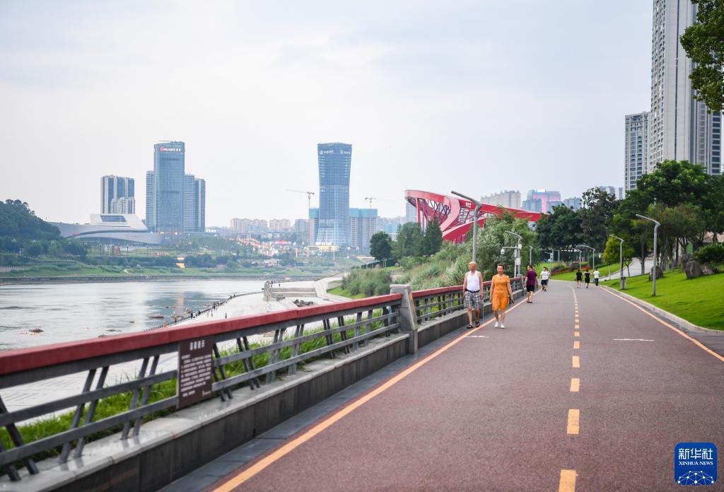 人们在四川省宜宾市三江口长江边的绿道上散步(6月28日摄)。新华社记者王曦 摄