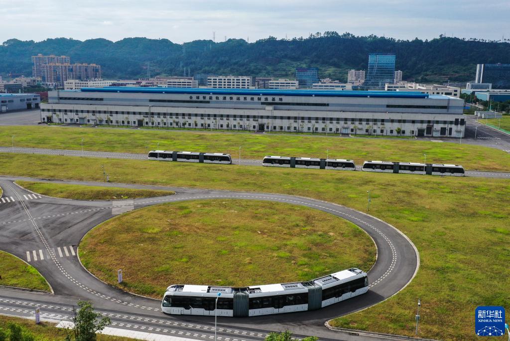 这是6月29日在四川省宜宾市拍摄的三江新区通往南溪区的智能轨道快运系统T4线,该线沿着长江边运行(无人机照片)。新华社记者江宏景 摄