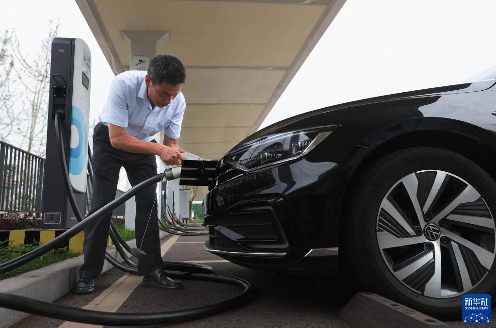 一位驾驶员在四川省宜宾市三江新区东部产业园能源港的光伏雨棚下为新能源汽车充电(6月29日摄)。新华社记者江宏景 摄