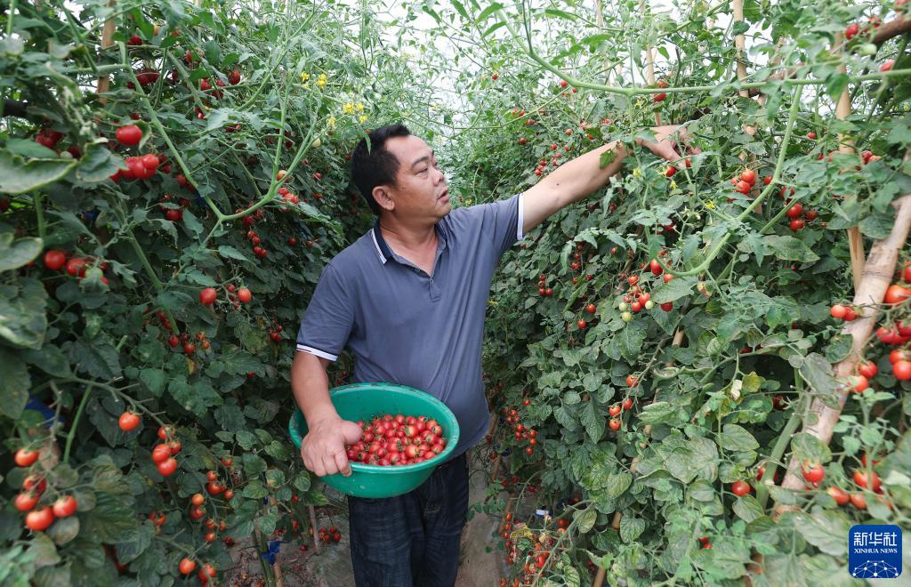 一位村民在四川省宜宾市南溪区长江村的“菜稻菜”蔬菜示范基地里采摘水果西红柿(6月29日摄)。新华社记者江宏景 摄