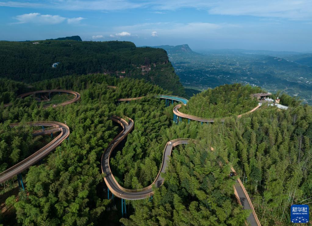 这是6月30日在四川省宜宾市蜀南竹海拍摄的竹尖漫步步行走廊(无人机照片)。新华社记者江宏景 摄
