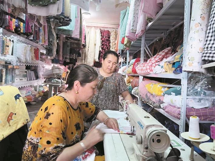 “第一次见到她的时候,她骑着三轮车走街串巷卖小商品,小小的身子,骑着三轮车实在让人心疼。”经过几次交往,了解米热姑·土荪的基本情况后,王素丽和丈夫商量,决定把金山农贸市场的店铺免费租给她。“米热姑·土荪之前做过裁缝,有技术,开个裁缝店没问题。”王素丽以第一年免租金的方式,把自己的一间面积约40平方米的店铺租给米日姑·吐荪,让她开缝纫店。