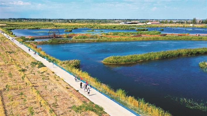 十师一八三团开展“全民健身 健康生活”环保出行徒步活动,150余名职工群众参加。图为职工在一八三团七连芦花湖湖畔徒步健身(资料图片)。曹士叶 摄
