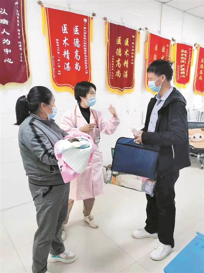 葛莉(中)向患儿家属叮嘱出院后的注意事项(资料图片)。九师医院提供