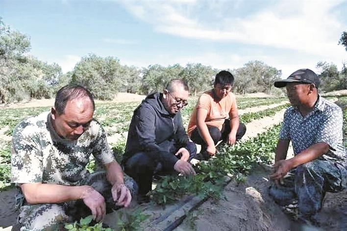 王金宝(左)在二师二十五团二连农田里与职工一起观察农作物长势(资料图片)。杨君 摄