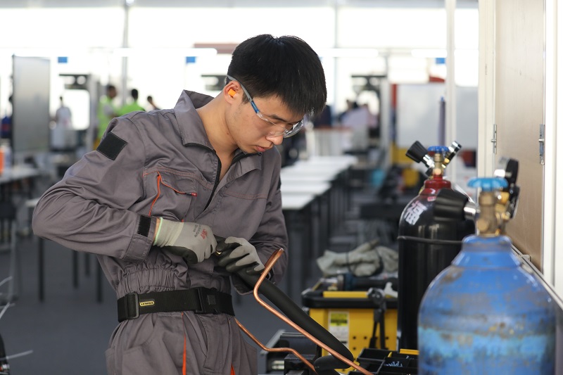 制冷与空调(世赛)项目选手吴扬在参加比赛。
