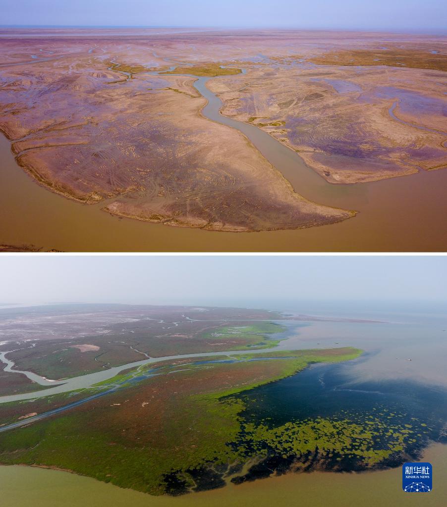 这是一张拼版照片:上图为2018年6月23日拍摄的山东黄河三角洲国家级自然保护区互花米草未治理时的画面;下图为2021年10月27日拍摄的山东黄河三角洲国家级自然保护区互花米草治理后的画面(无人机照片)。近年来,保护区实施黄河三角洲湿地生态系统修复工程,开展退耕还湿、退养还滩,推进河口湿地自然修复和河湖生态联通,有效恢复了湿地功能,提高了生物多样性。新华社记者郭绪雷 摄