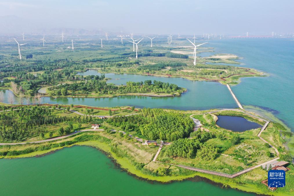 这是2021年7月8日拍摄的河北省怀来县官厅水库国家湿地公园景色(无人机照片)。近年来,怀来县不断加强官厅水库生态湿地保护与修复工程,官厅水库及上游永定河流域的生态环境明显改善。新华社发 武殿森 摄