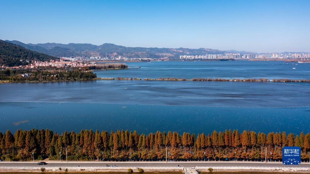 这是2023年1月12日拍摄的昆明滇池一景(无人机照片)。滇池自2018年上升为Ⅳ类水质后,连续5年保持全湖水质Ⅳ类。近年来,昆明市通过开展面山防洪滞蓄建设、实施雨污分流改造、建设湖滨生态带、全面深化河长制等措施,滇池生态状况得到持续改善,滇池湖滨已形成平均宽度约200米、植被盖度80%以上的闭合生态带。新华社记者胡超 摄