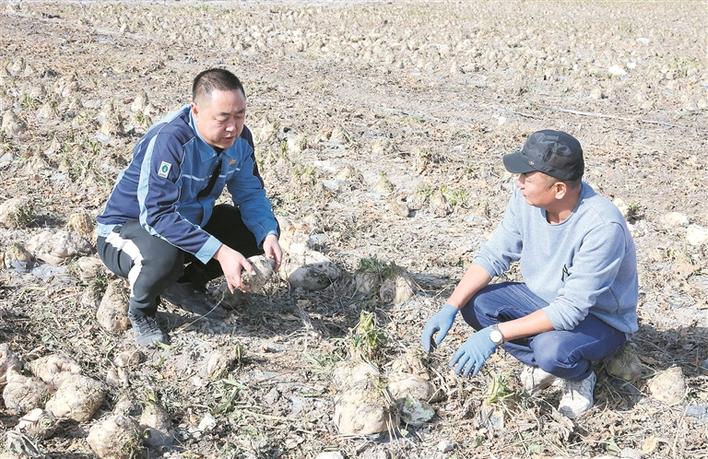 新疆冠农数字农业科技有限公司工作人员(左)与甜菜种植户一起查看甜菜长势(摄于10月25日)。 兵团日报常驻记者 魏承亿 通讯员 候晓燕 摄