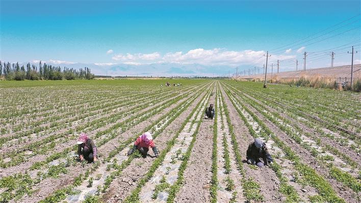 在位于二师二十二团兵地共建的两红产业示范基地里,兵地职工群众在务工增收(摄于6月9日)。兵团日报常驻记者 魏承亿 摄