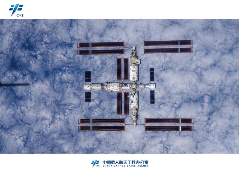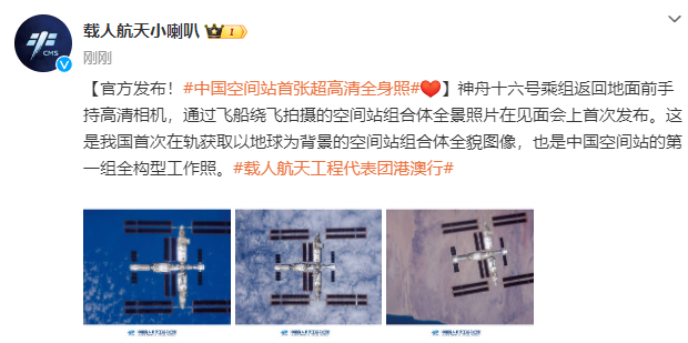 神舟十六号乘组返回地面前手持高清相机,通过飞船绕飞拍摄的空间站组合体全景照片在见面会上首次发布。这是我国首次在轨获取以地球为背景的空间站组合体全貌图像,也是中国空间站的第一组全构型工作照。