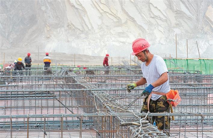 图木舒克经济技术开发区新疆天鹭新材料科技有限公司年产5万吨生物质纤维素纤维项目建设工地上,工人在加紧施工(资料图片)。该公司年产5万吨生物质纤维素纤维项目预计总投资25亿元,分三期建设,其建成投产,将填补新疆生物质纤维素纤维生产领域的空白。兵团日报全媒体记者陈洋 摄