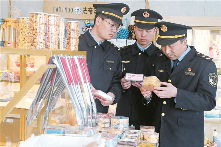 七师市场监管综合行政执法支队第一执法大队组织执法人员在一三〇团中学附近商超检查零售食品质量(摄于10月17日)。兵团日报常驻记者 张西安 摄