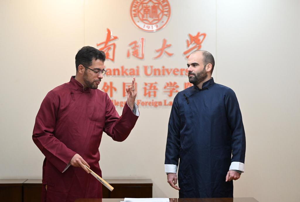 一把折扇、两袭长衫,辅以略显夸张的肢体动作和表情……在南开大学外国语学院的教室里,两位“老外”用西班牙语说起了相声,并依托学校平台对外传播。新华社记者 李然 摄