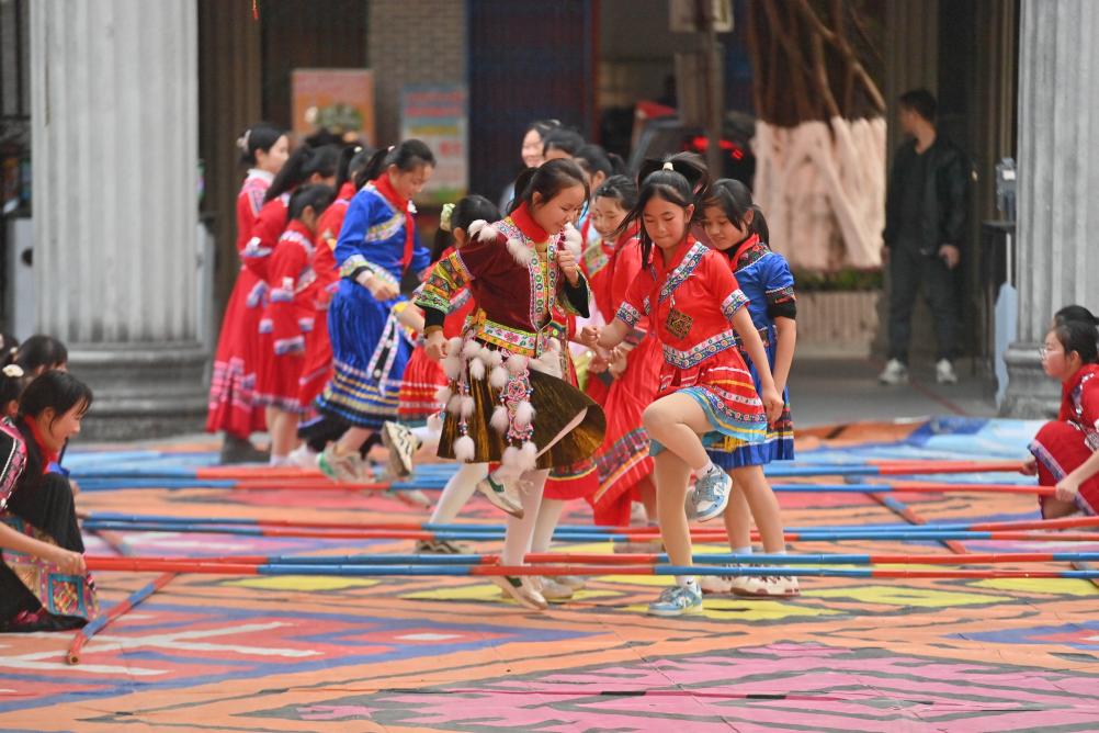 2023年12月28日,在柳州市融安县实验小学,学生们在跳竹竿舞。新华社记者 黄孝邦 摄