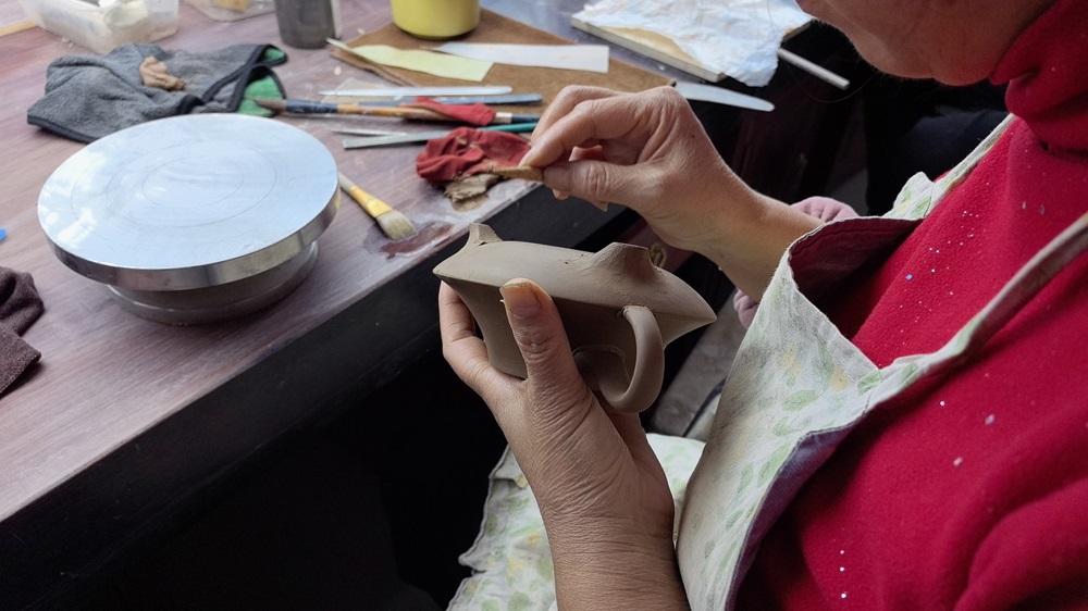 技术人员正在进行紫砂壶的制作。胡杨网 李雨浪 摄