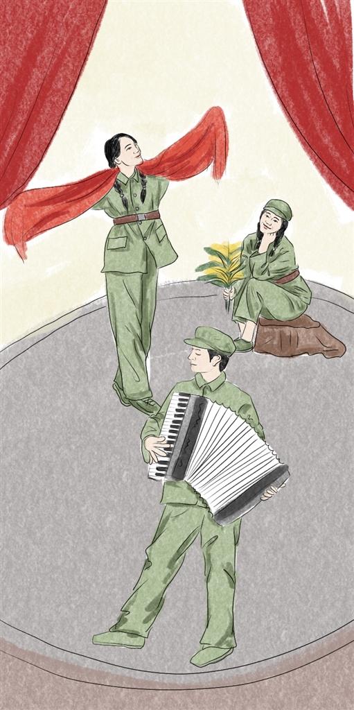到了演出那天,团部大礼堂挤满了看节目的人。轮到我们上场时,一开始我们还有些紧张,但随着伴奏音乐响起,我们渐渐进入状态,完全融入舞蹈中……节目结束时,台下响起了热烈的掌声。