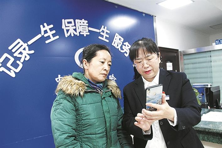 1月12日,五师八十九团社保所党员唐秋红(右)为办事群众讲解线上办理业务的注意事项。张培丽 摄