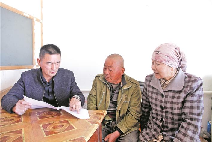 2月25日,九师一六七团一连党支部书记、连管会指导员周军强(左)到该连职工家中宣传种植和养殖方面的有关政策。兵团日报常驻记者苟汇敏 摄
