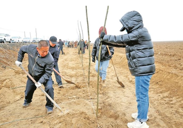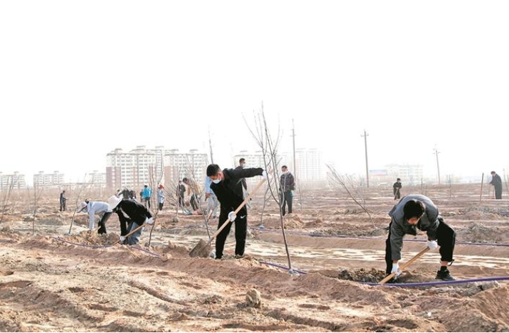 十四师二二四团干部职工群众500余人在昆玉市城南特色经济林开展春季植树活动(资料图片)。陈欢 摄