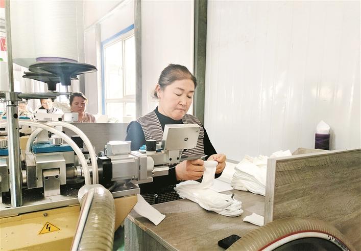 “我们将生产机器安装在连队闲置房屋或职工群众家里,由公司提供生产设备、负责水电费用。职工群众自行使用管理,只需在‘家庭工坊’完成织袜的最后三道工序(缝头、翻袜、定型),生产出的达标产品由公司统一收购。这些工作简单易学,经过1个月左右的操作培训,上年纪的老人也可以操作。”余敏说,这一生产模式,既满足企业用工需求,还能通过产业带动就业,帮助职工群众增收致富。