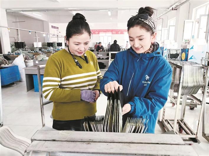 走进位于三师图木舒克经济技术开发区达坂山工业园区的唐锦纺织有限公司,只见工人们将生产的半成品袜子打包装袋,准备送往附近各处的“家庭工坊”继续制作。