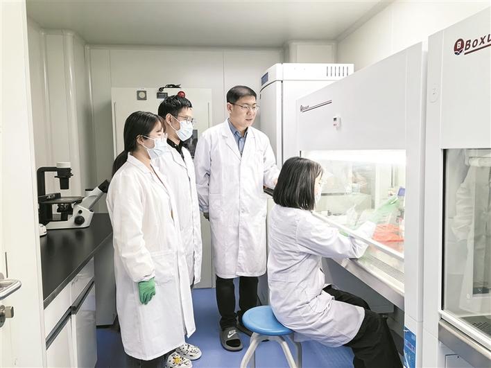 4月12日,在石河子大学医学院的实验室里,马克涛(右二)指导学生进行实验。郭艳丽 摄