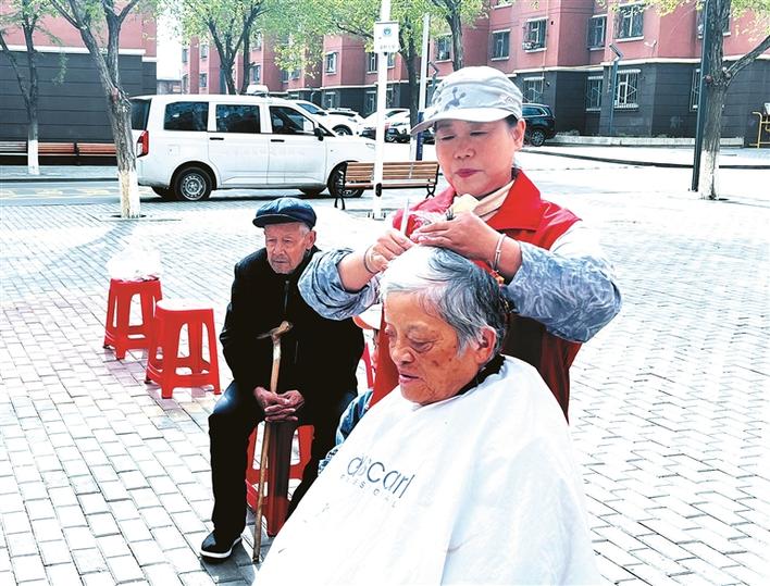 4月29日,十二师头屯河农场绿洲街南社区义剪志愿队队员俞淑霞(右)为佳福小区的老人理发。刘洋 摄