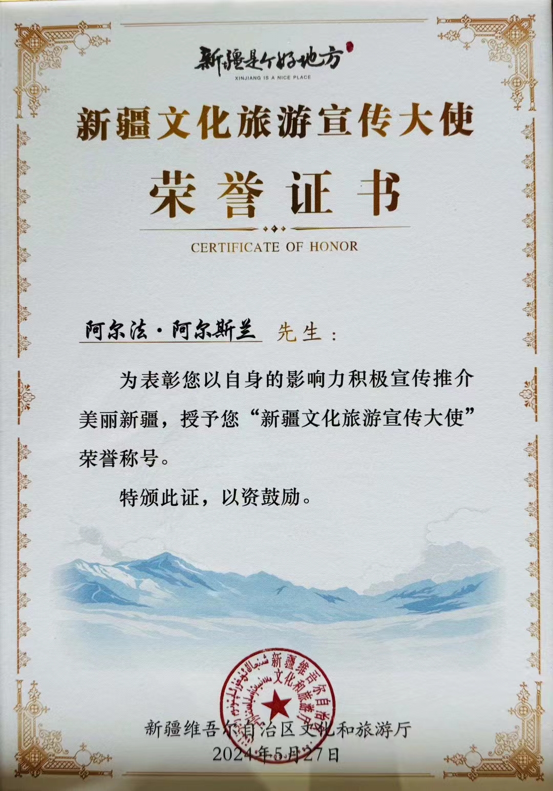 自治区文化和旅游厅授予阿尔法·阿尔斯兰新疆文化旅游宣传大使,图为荣誉证书。