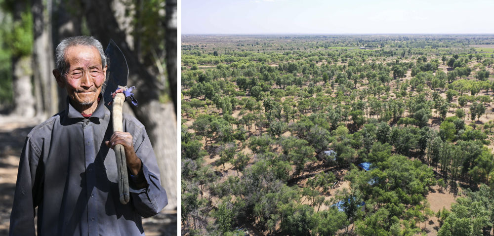 在新疆柯柯牙,当地政府推行以林果业为主的“谁建设、谁管护、谁投资、谁受益”荒漠绿化造林模式,在防护林网中套种苹果、核桃、红枣等经济林,延续生态成果。