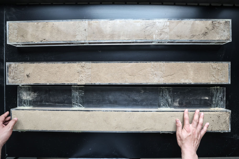 “草根博士”吕林有在辽宁省农业科学院沙地治理与利用研究所章古台基地实验室整理提取的沙地土壤剖面样本(2024年5月30日摄)。新华社记者 潘昱龙 摄