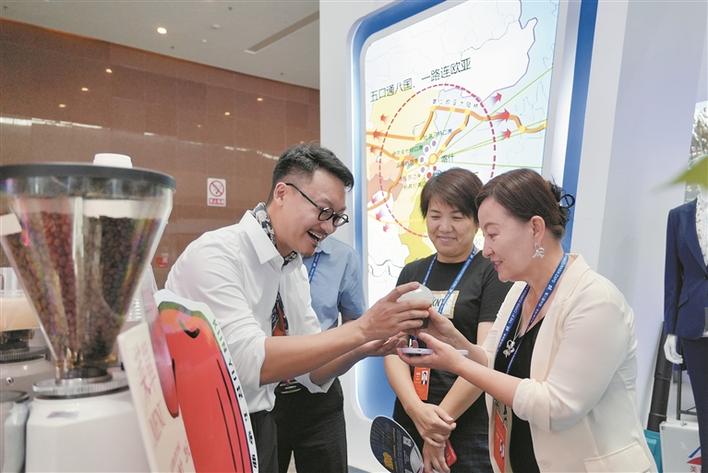 在第八届中国—亚欧博览会兵团展区十四师昆玉市投资合作形象展区,工作人员邀请客商品尝特色红枣咖啡。