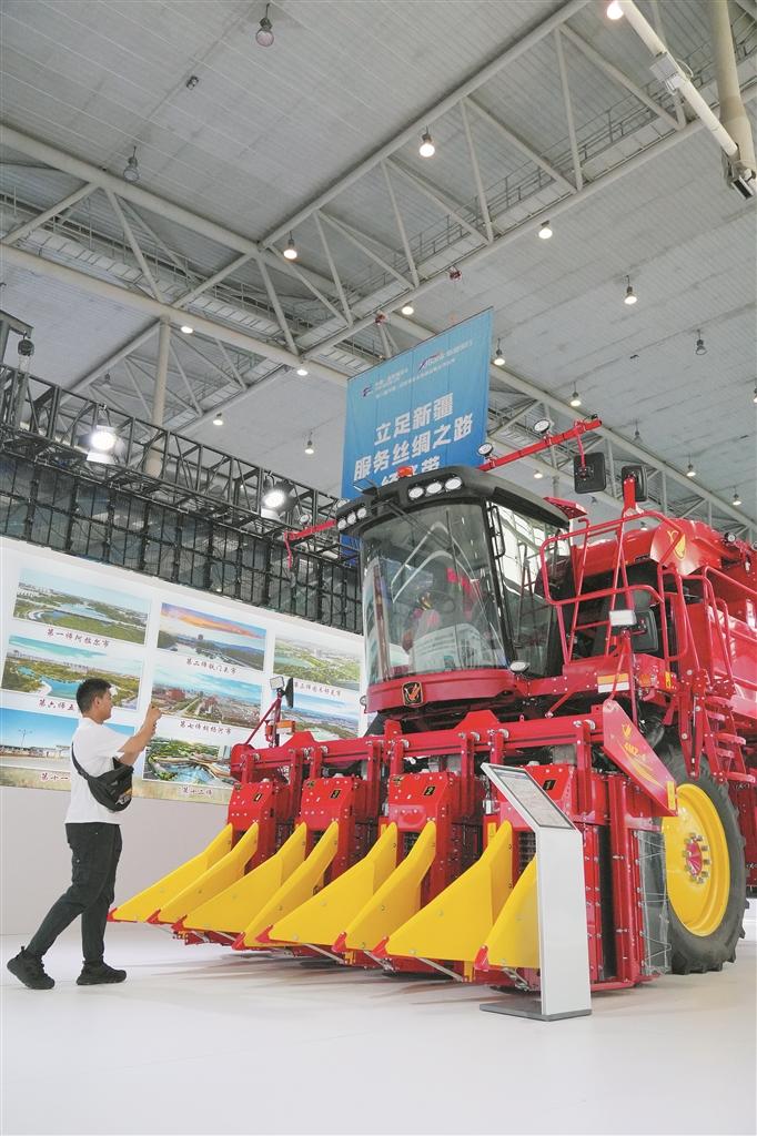6月27日,在第八届中国—亚欧博览会兵团投资合作形象展馆内,新疆天鹅现代农业机械装备有限公司展出的四行箱式采棉机吸引观众驻足观看。