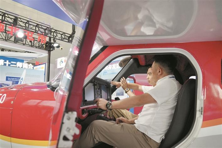 6月26日,在第八届中国—亚欧博览会兵团展区十二师投资合作形象展区,新疆万户宇航工业有限公司工作人员向观众介绍AG50轻型运动飞机。