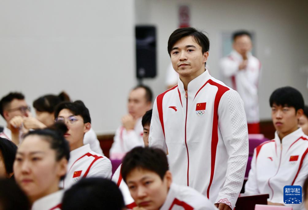 7月13日,巴黎奥运会中国体育代表团成立动员大会在北京举行。这是中国体育代表团成员刘洋在大会前。新华社记者 丁旭 摄