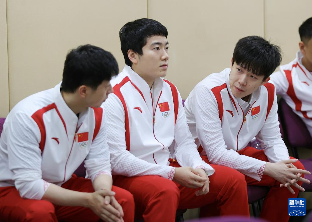 7月13日,巴黎奥运会中国体育代表团成立动员大会在北京举行。这是中国体育代表团成员马龙、梁靖崑和王楚钦(从左至右)在大会前。新华社记者 丁旭 摄