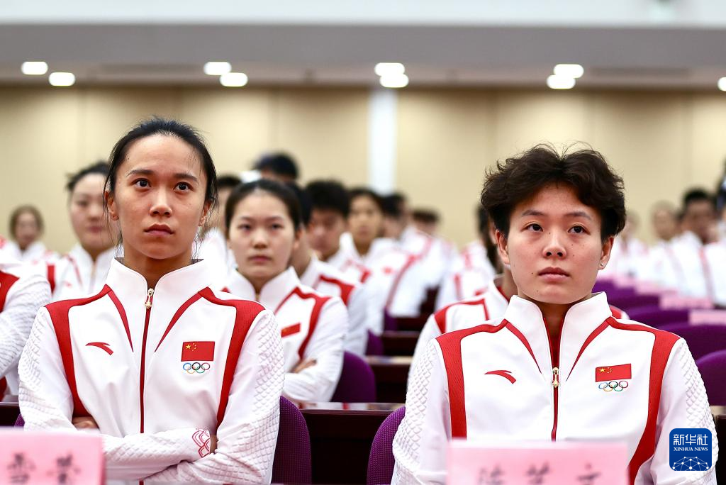 7月13日,巴黎奥运会中国体育代表团成立动员大会在北京举行。这是中国体育代表团成员吴艳妮(中)在大会前。新华社记者 丁旭 摄