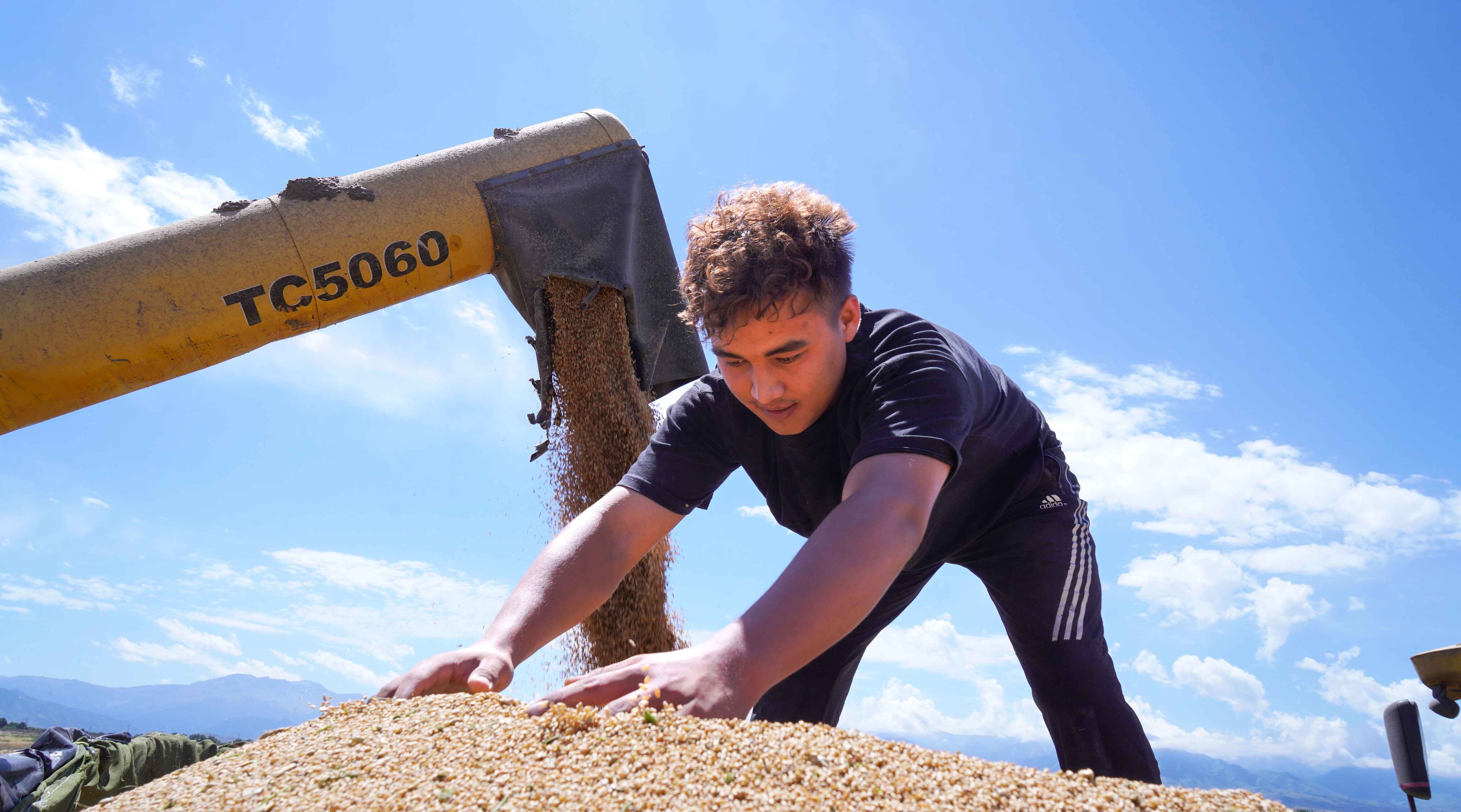 7月17日,在四师六十七团麦田里,种植户在平整运粮车上的冬小麦。