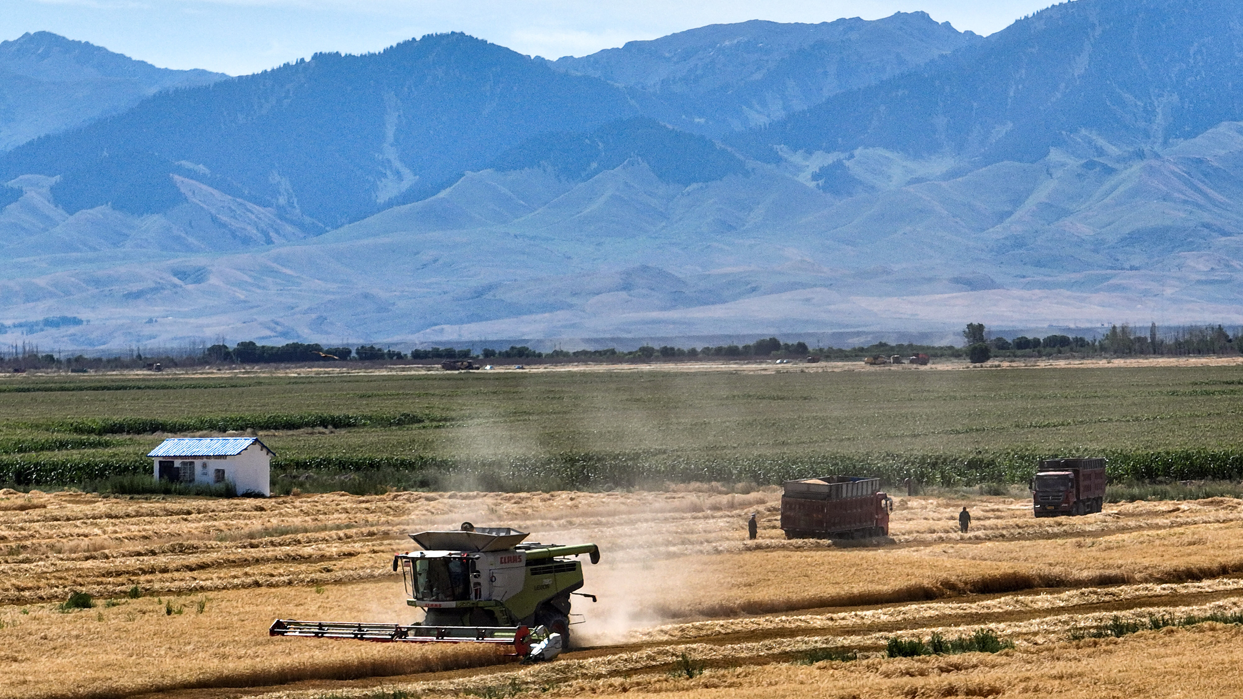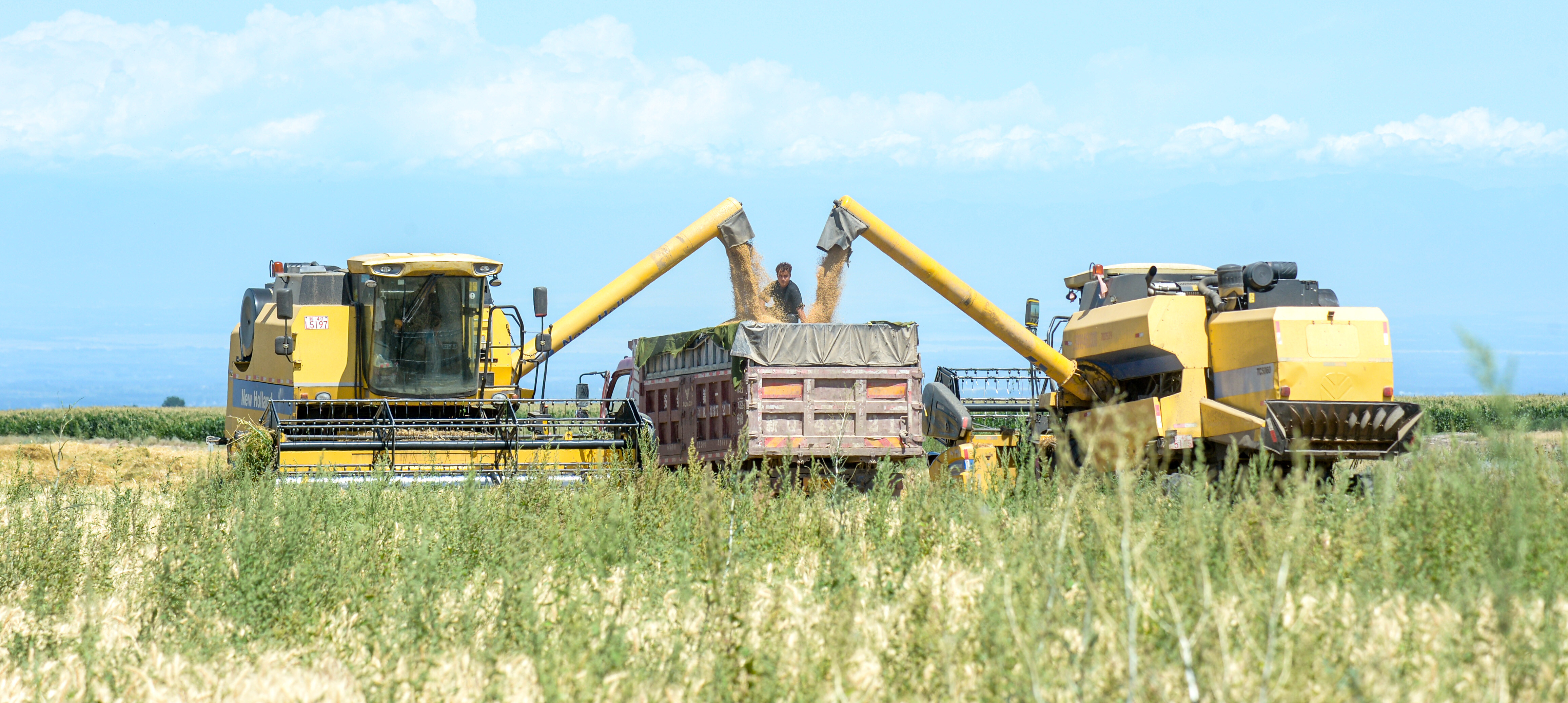 7月17日,在四师六十七团麦田里,两台大型收割机在放粮。