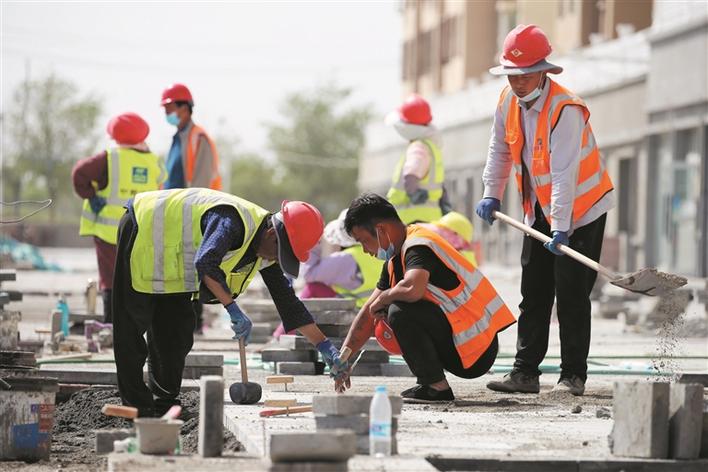 8月3日,在十二师头屯河农场小区改造提升项目施工现场,工人进行铺砖作业。该项目投入资金2000万元,预计11月初完成改造,将惠及居民4000余户,有效提升他们的幸福指数。向浪、陈珂 摄