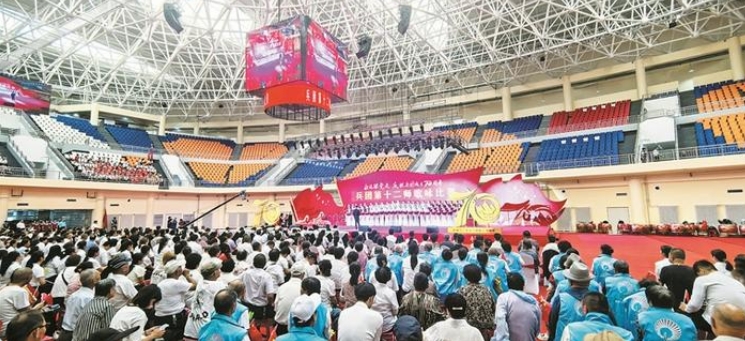 8月28日,十二师举办庆祝兵团成立70周年歌咏比赛,图为活动现场。高迪 摄