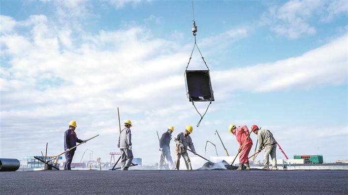 七师胡杨河市新疆三昌环保能源有限公司年产40万吨煤焦油资源化利用项目工地的工人在铺设路面(资料图片)。兵团日报全媒体记者 陈洋 摄