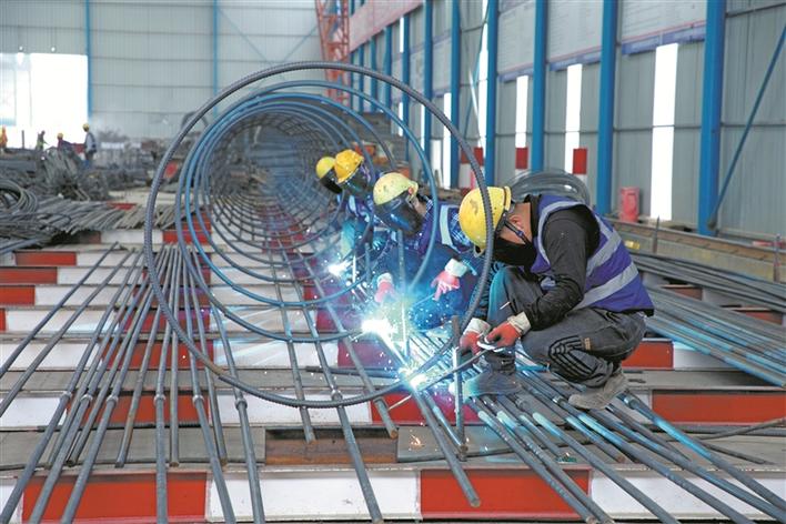 8月20日,在G3036阿克苏至阿拉尔高速公路项目第二合同段的钢筋加工场里,工人在焊接钢筋笼。古力米拉·亚力坤 摄