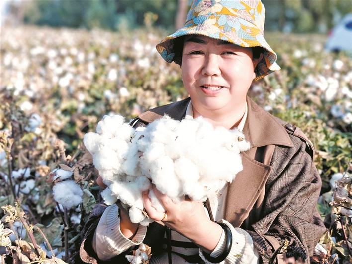 希望的田野上,丰收画卷铺展开来,五师双河市71万亩棉花全面开采,一台台采棉机在广袤棉田穿梭作业,职工群众抓住晴好天气收获交售。五师九〇团职工王力新说:“在国庆节收获高产棉花,可谓喜上加喜,感觉很棒!”