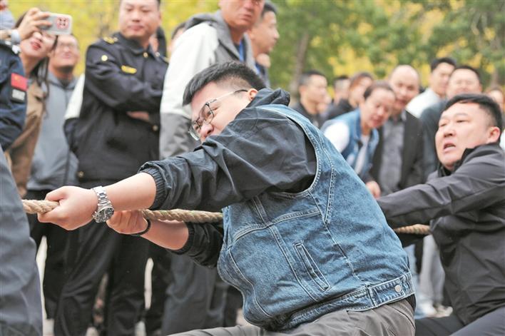 9月26日,九师白杨市直属机关举办“礼赞祖国 奋进白杨”拔河比赛,参赛选手在奋力夺取比赛胜利。李睿 摄