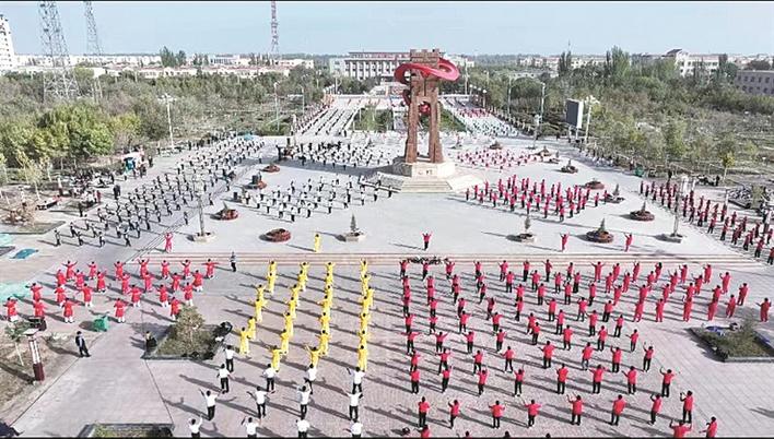 9月29日,为庆祝新中国成立75周年,三师伽师总场“永远跟党走 奋进新时代”千人健身操广场舞比赛在党建主题文化广场举行。来自连队、社区、机关单位、周边乡镇等22支广场舞队伍共1万多人参加了此次活动。艾热提·木沙江、常金国 摄