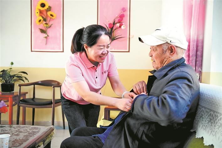 10月15日,护理人员在六师新湖农场吾家乐宝养老院帮助老人整理着装。张静 摄