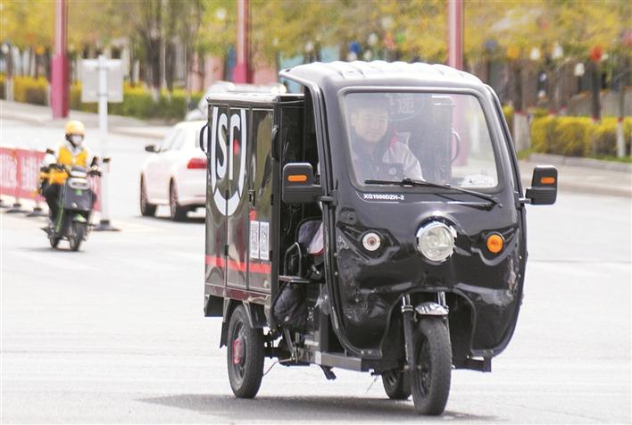 一名快递员在十师北屯市为顾客配送快递(资料图片)。兵团日报常驻记者 李正虎 摄
